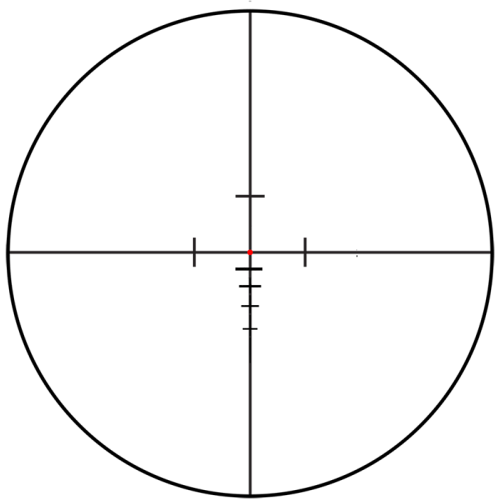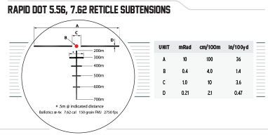 The 3TR Rapid Dot reticle is a proprietary CQB reticle. It is available in the T5Xi 1x-5x24mm scopes calibrated in either 5.56mm or 7.62mm. The reticle gives the shooter holdovers out to 700 meters in 100 meter intervals.